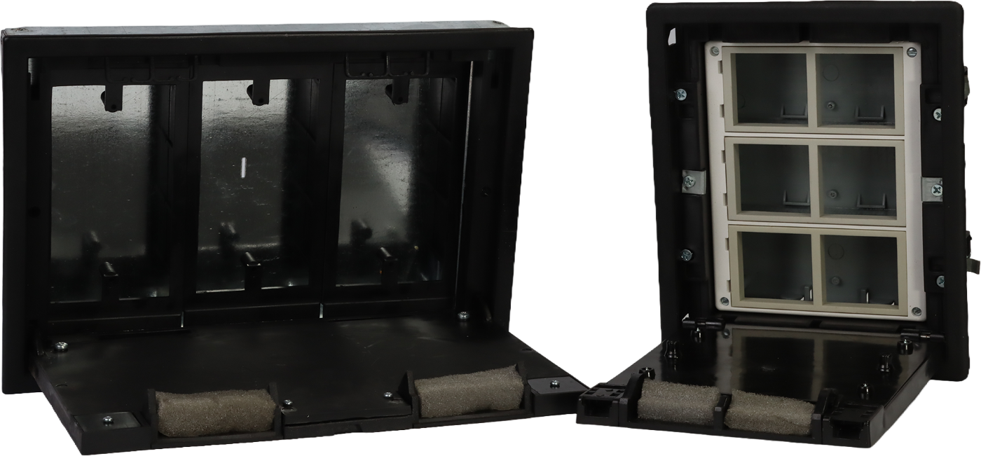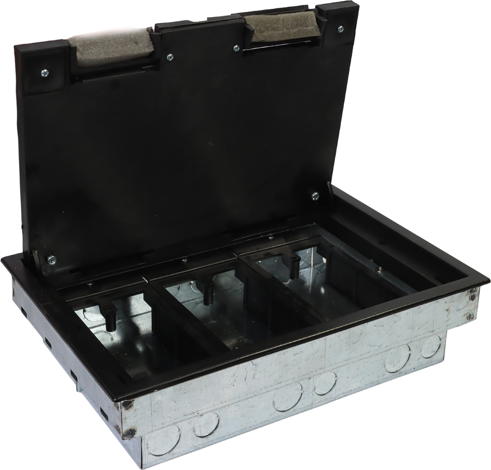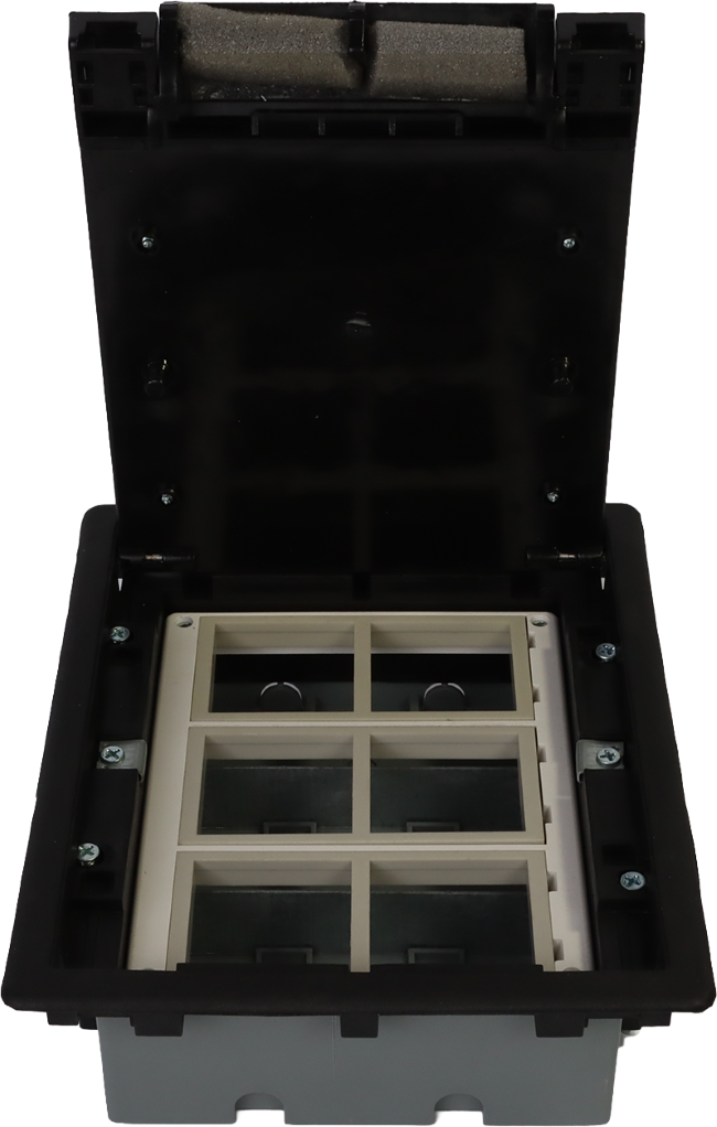 A floor box, or "floor block," is used to organize and connect electrical wiring and data cables within the floor.