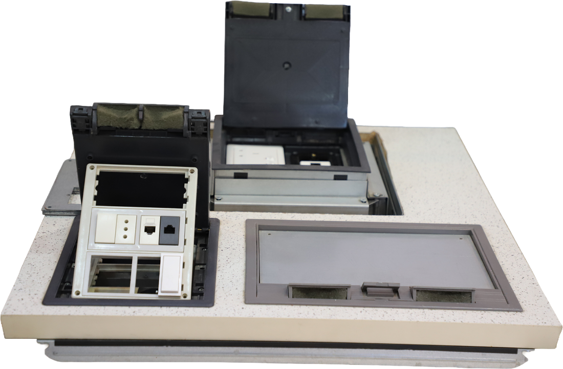 A floor box, or "floor block," is used to organize and connect electrical wiring and data cables within the floor.