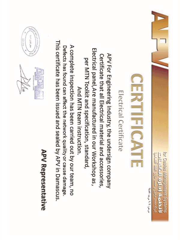 APV Certificate Electrical Panel